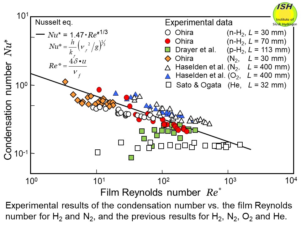 eq. as shown in the figure below. Relationships between the condensation number Nu* and the film Reynolds number Re* for hydrogen as obtained from the present experiment are shown in the figure below. Also, the previously obtained experimental data for hydrogen and helium,